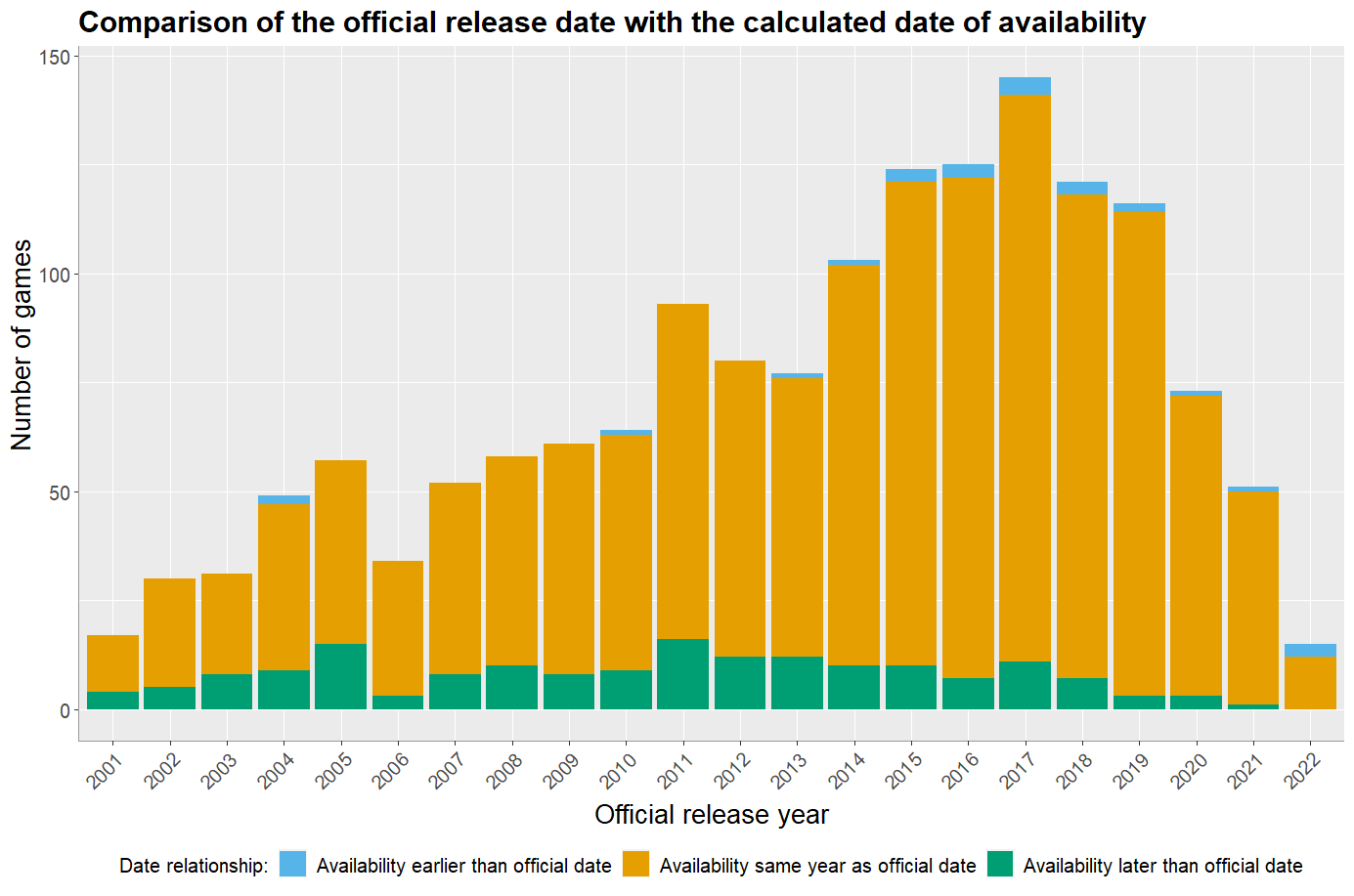 From the chart, it can be seen that the calculated availability largely matches the year of the official release. A small part of the games is not available in the year of release, but in later years. You can see that this number is lower in the most recent years than in the years before. However, here we must also take into account the data set, which only includes games with at least 2000 ratings. In order for a game from recent years to reach this limit, it must also be available. It is possible that an updated dataset in the future will show different ratios in these years.