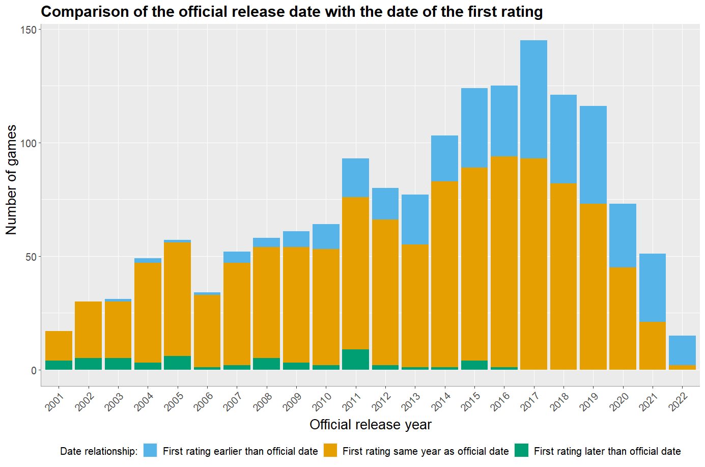 In chart 1, the official release year is compared to the year of the first rating for the games in the dataset. For a game, the first rating can appear either in a year before the official release, in the same year, or in a later year.